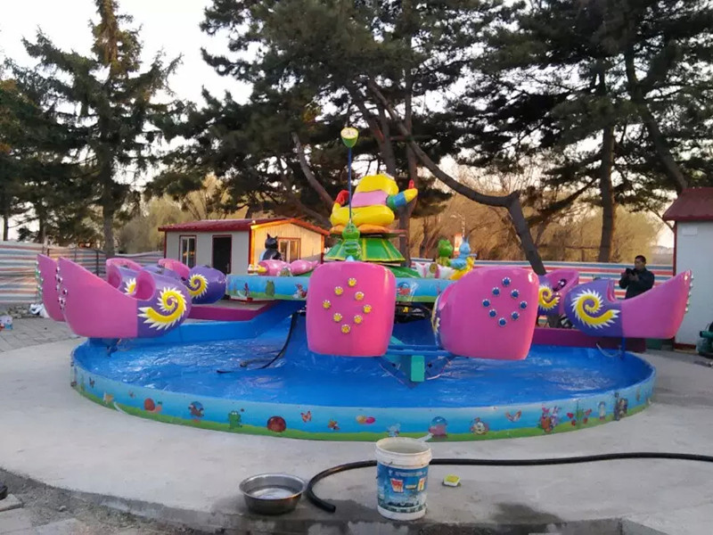 本設(shè)備為無基礎(chǔ)可移動的兒童游樂設(shè)備,適合商場、場和公園使用,因為蝸牛特工隊的占地面積不大,而且在6個大臂上有著12個座艙,可以容納12個成年人同時游玩,而且在同時,每個蝸牛殼座艙上面都有著個可以打水的蝸牛噴水槍